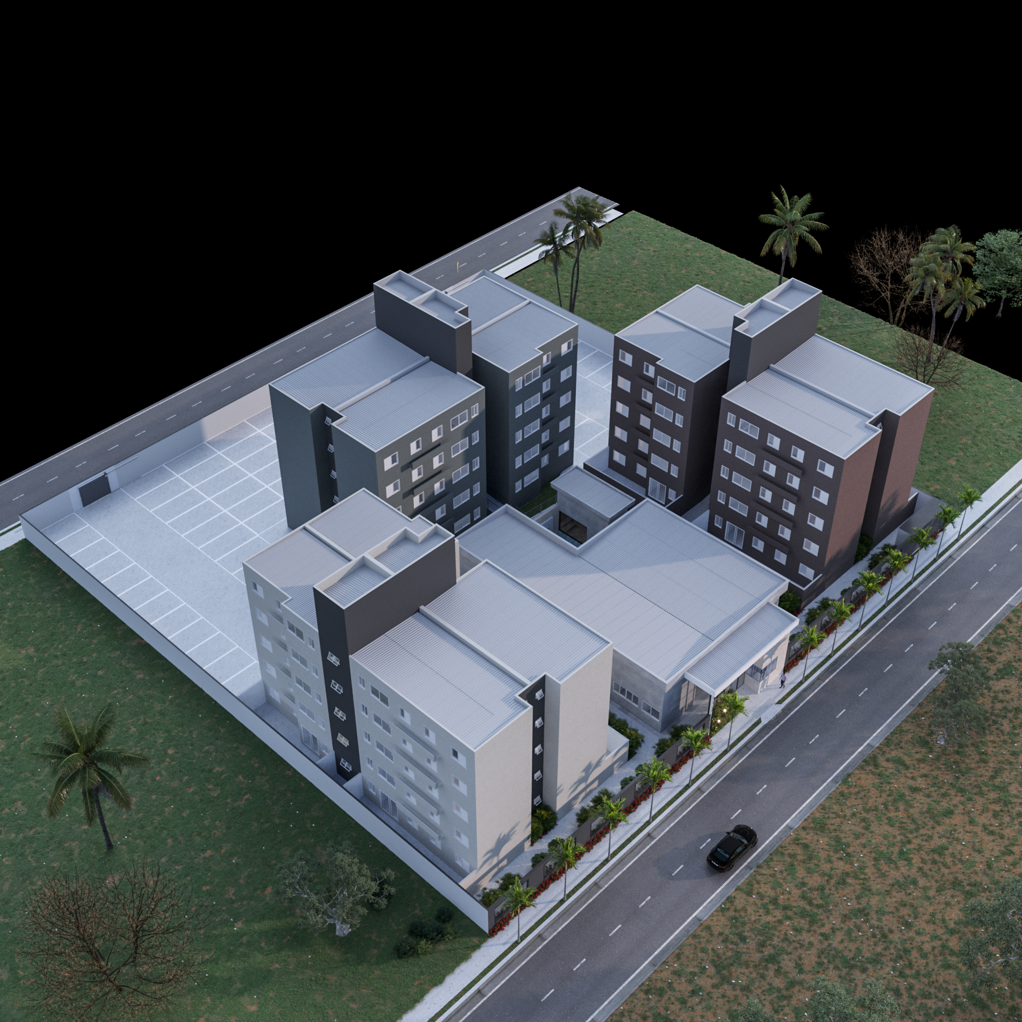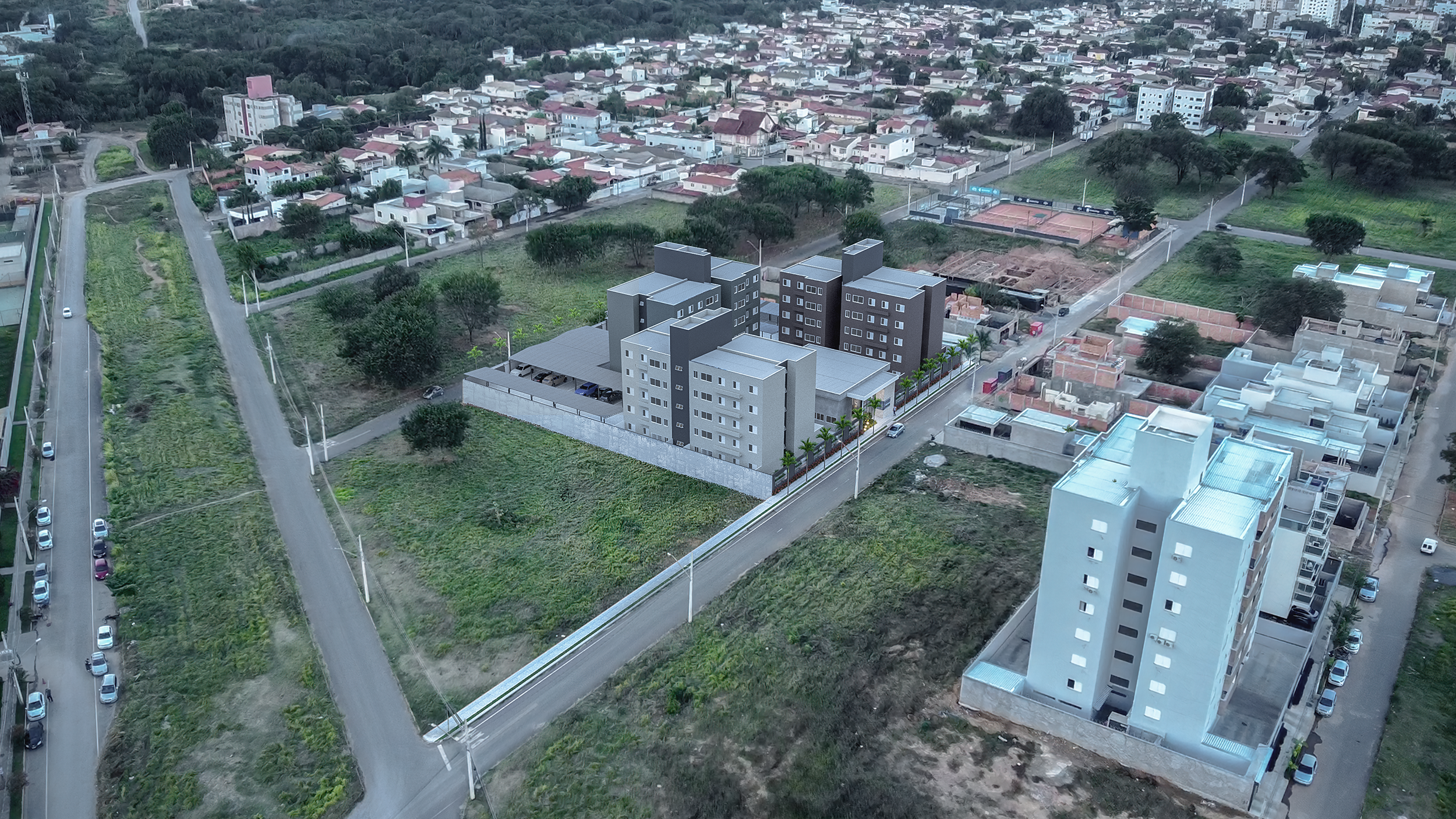 O condomínio conta com três prédios, são apartamentos de 02 e 03 quartos, cada prédio com 5 andares, sendo 4 apartamentos por andar, com elevador.