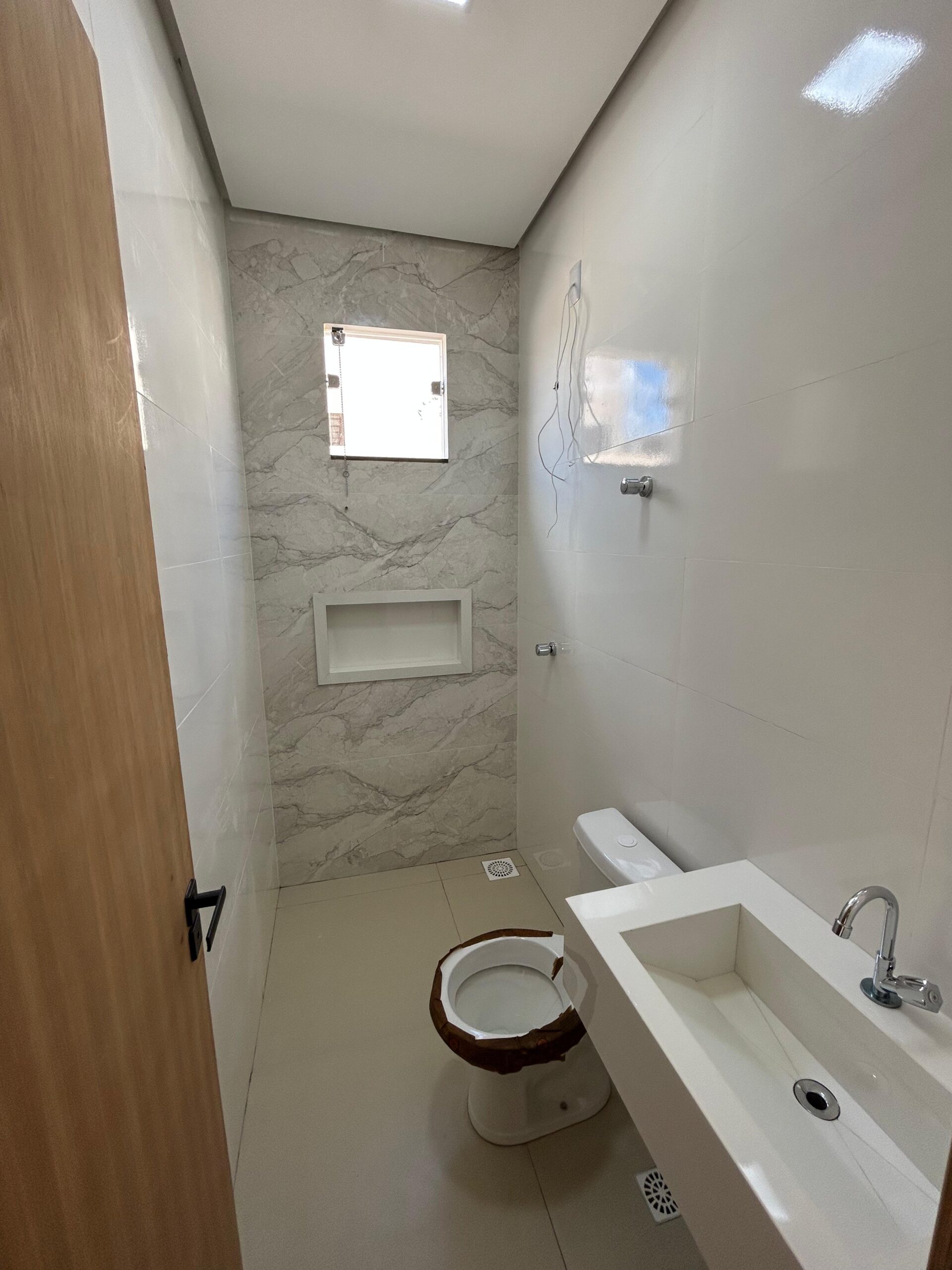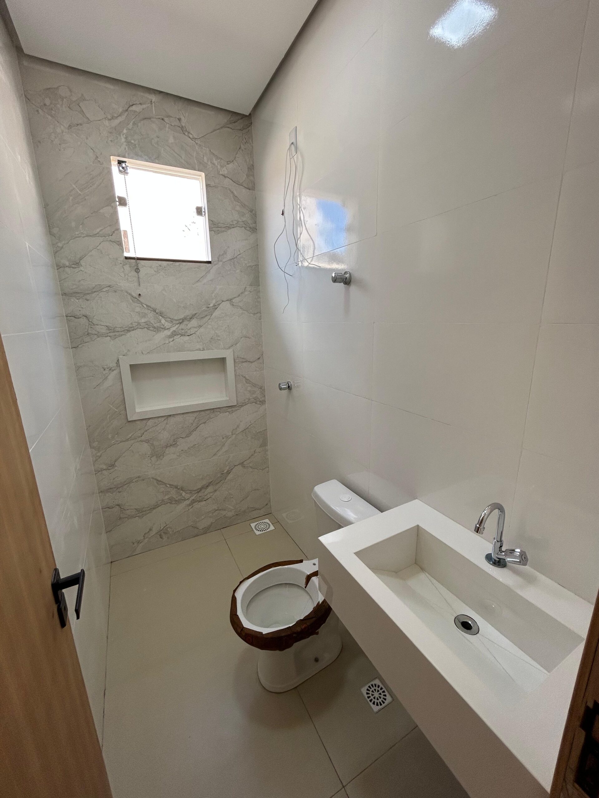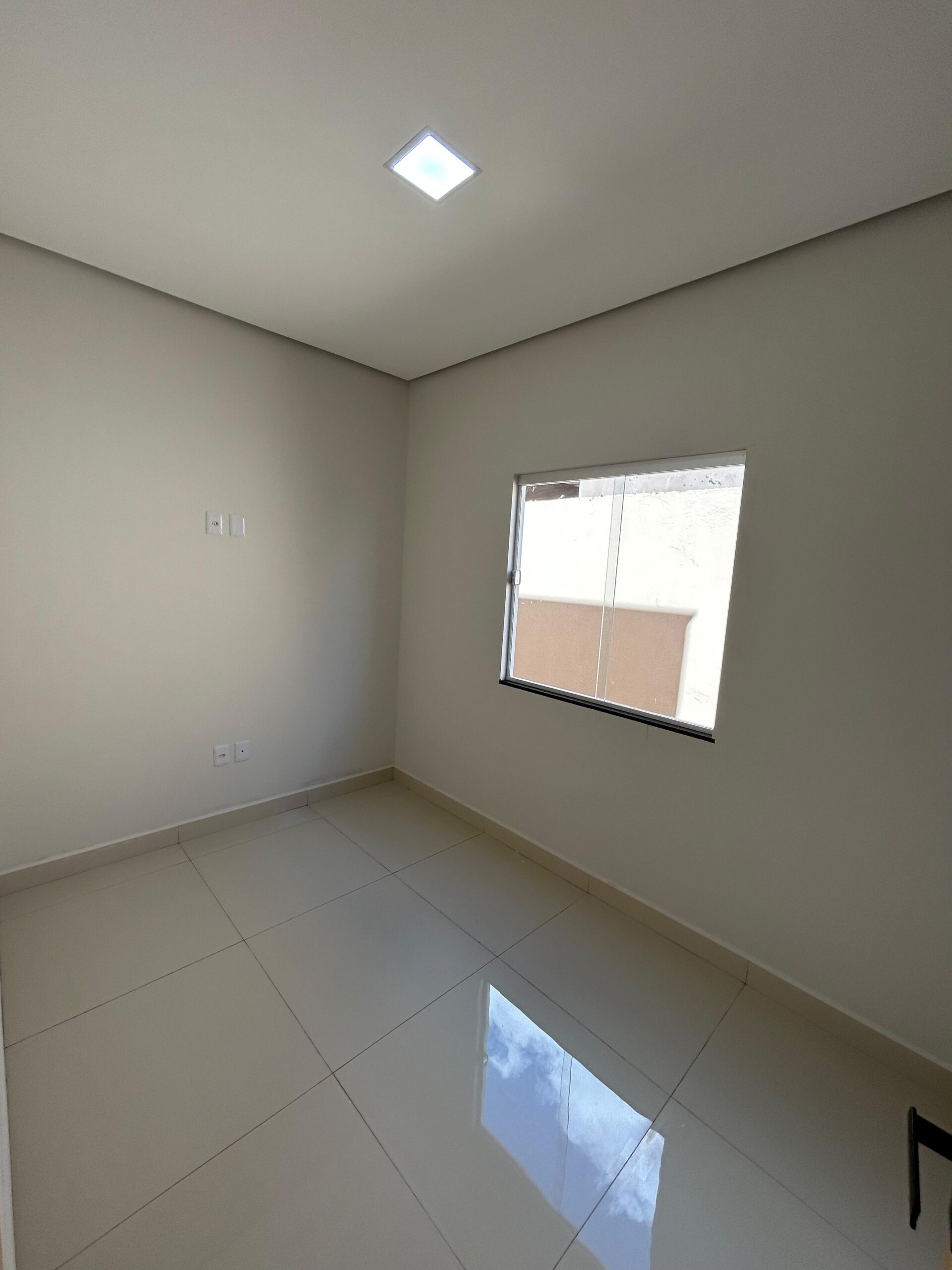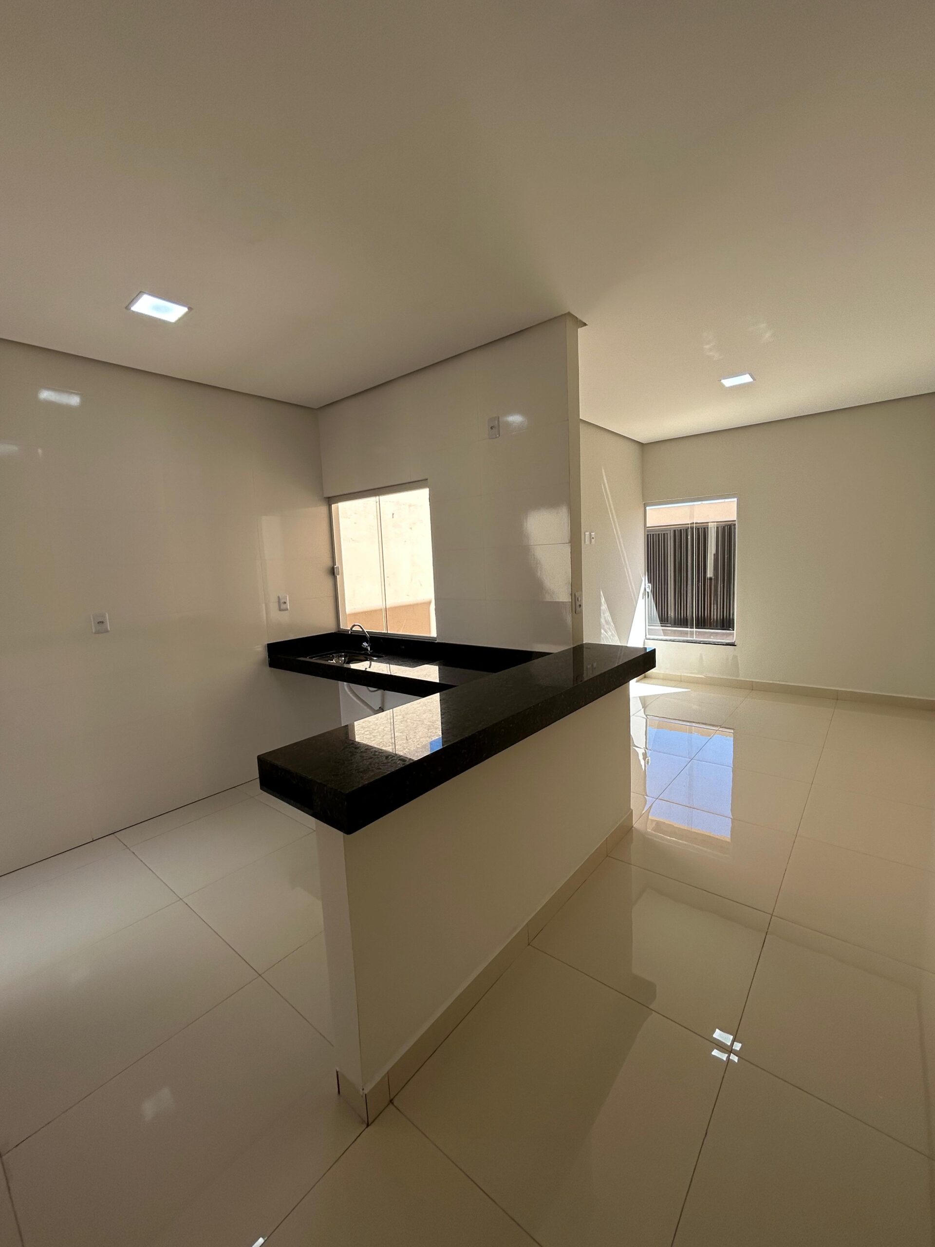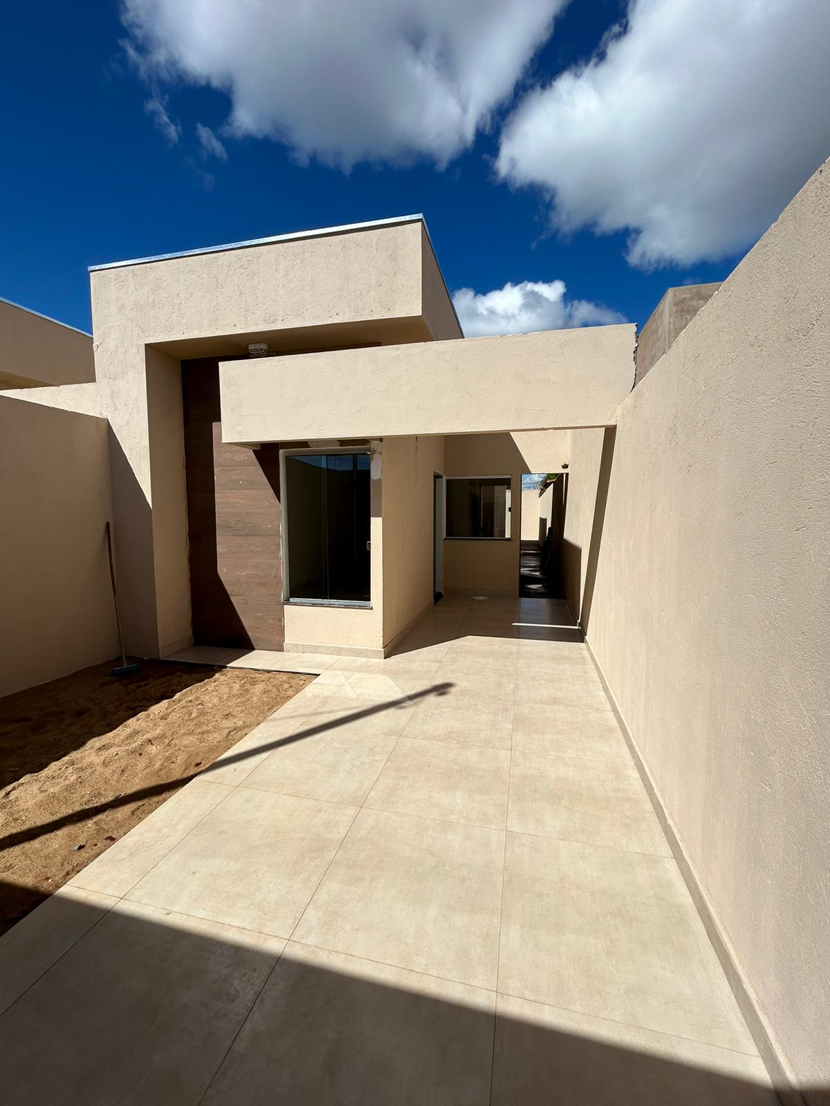 A casa possui uma sala, cozinha, área de serviço, banheiro social e dois quartos, sendo um deles uma suíte.